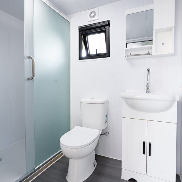 - Shower hub with rain maker shower head, shower rail, vanity with sink and flick mixer, overhead cupboard with mirror, toilet with soft close lid and exhaust fan.